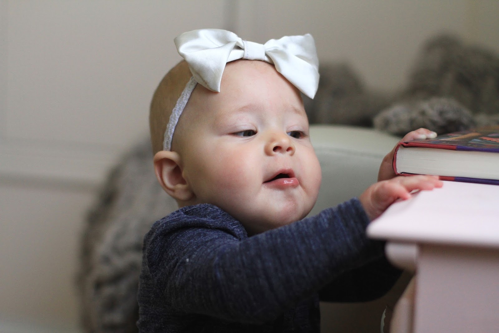 -Caught the movement bug a week or so ago and is now trying to walk and crawl all at once. We even found her sitting up in the corner of her crib yesterday. This all makes for an exhausted mama, because she wants to move but needs my help all the time. Luckily, standing against the couch or a chair on her own keeps her happy for 10 minute intervals and I can get things done.